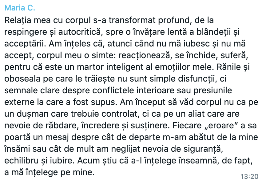 Învățăm cum să ne raportăm la corp nu ca la un proiect de îmbunătățit, ci ca la o ființă de iubit.